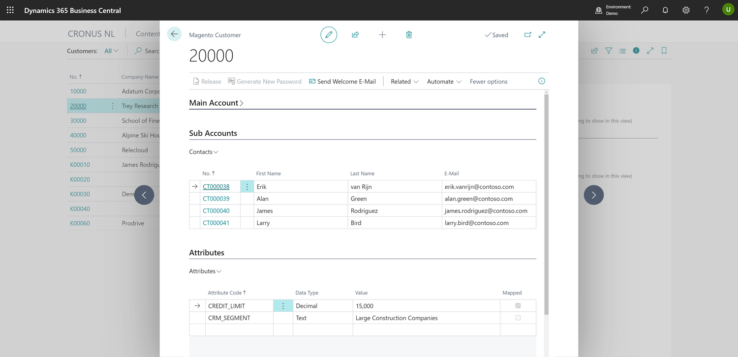 • The ability to create sub-accounts. Each Business Central contact can get their own Magento login.