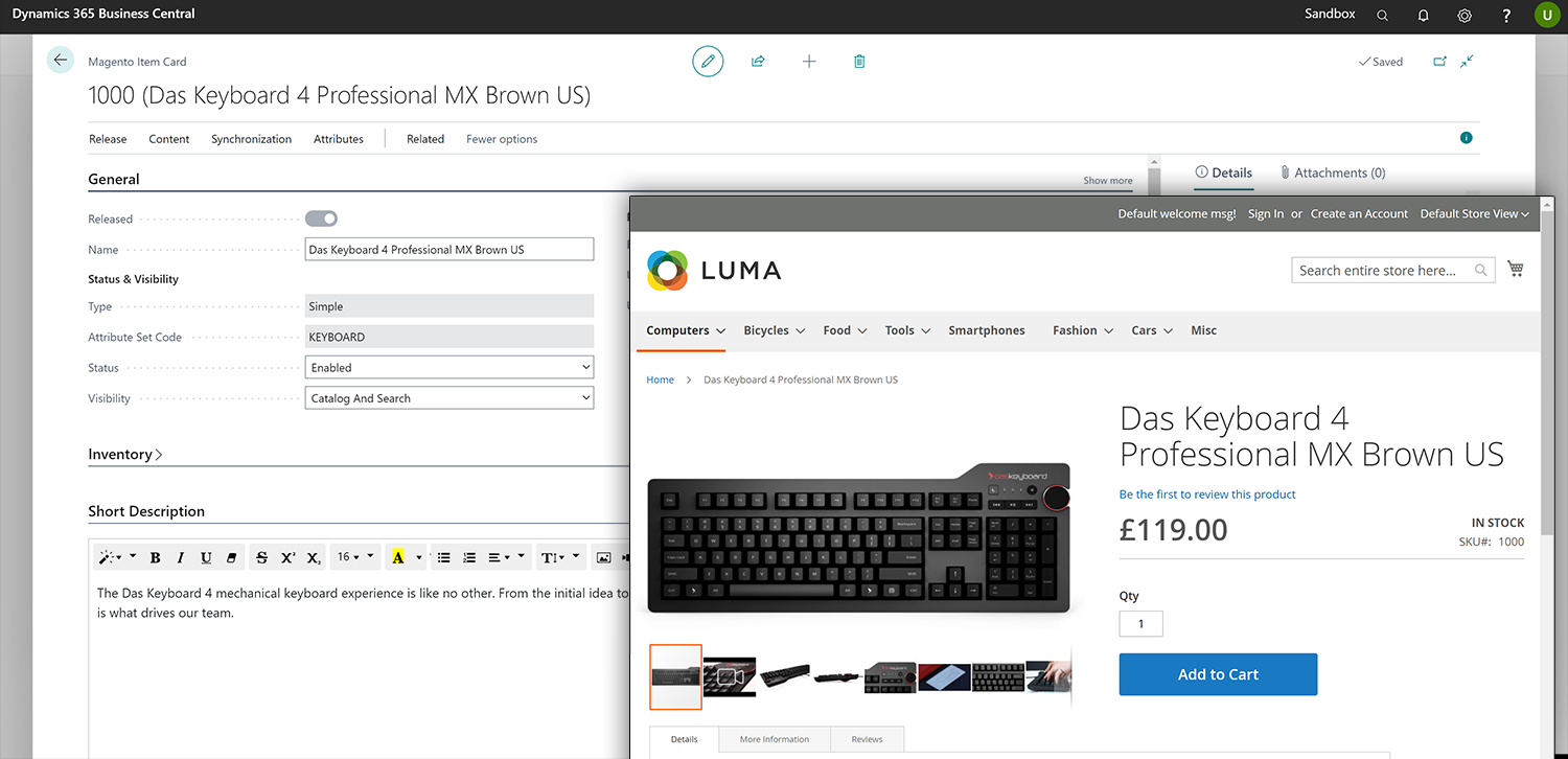 Working with Commerce 365 for Magento means that you never have to worry about the technicalities of integration. It is just there. No mapping, no nerdy details. Just, publish products, add attributes, invite customers and it all works, integrated, out of the box.